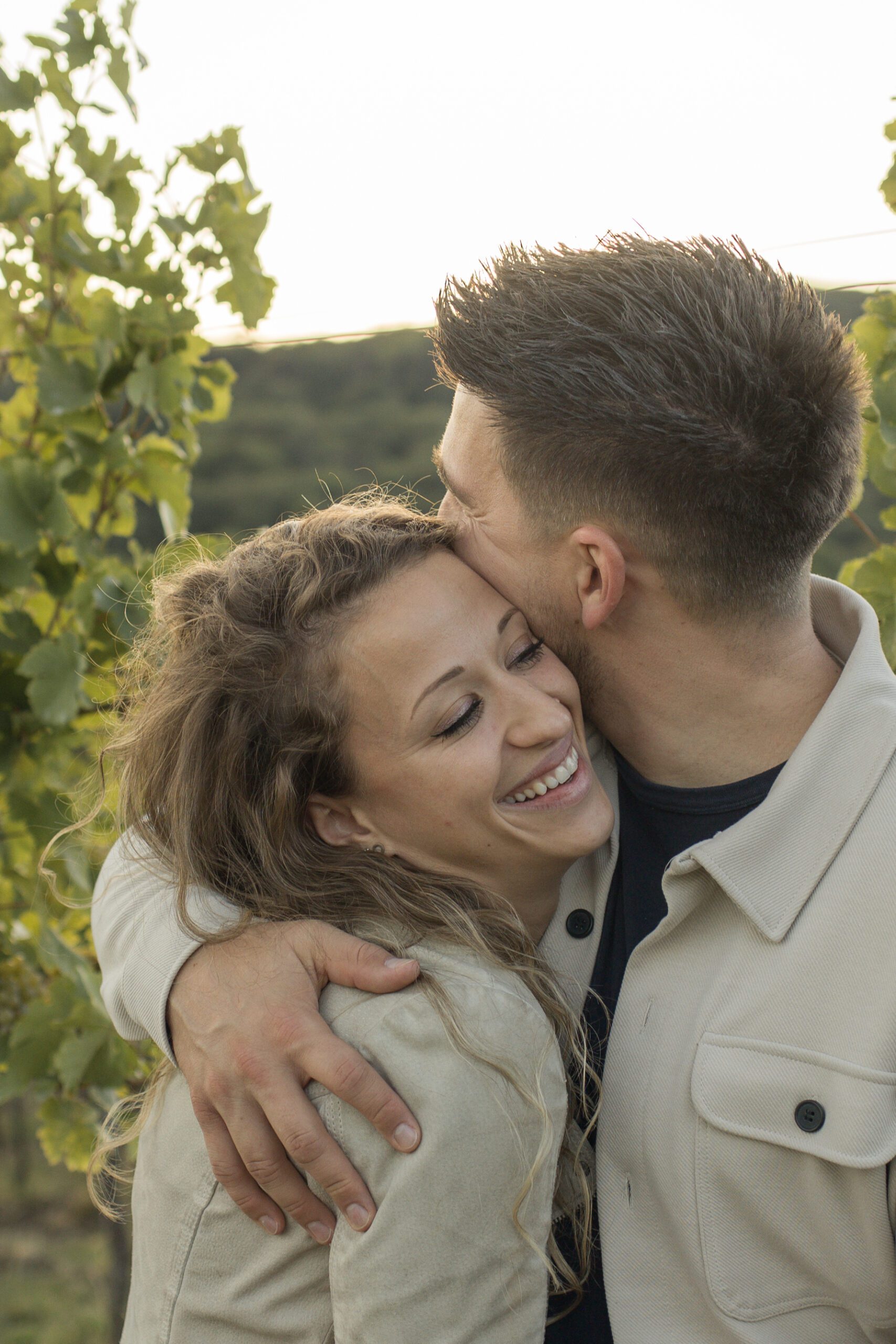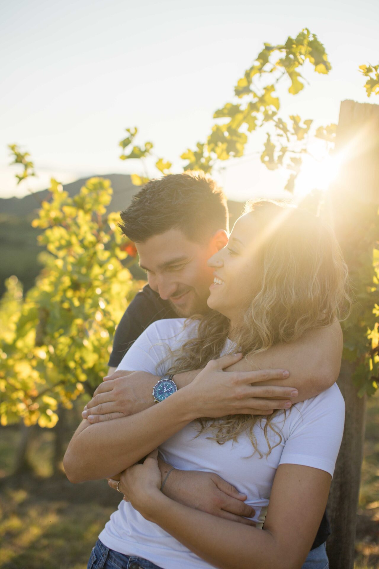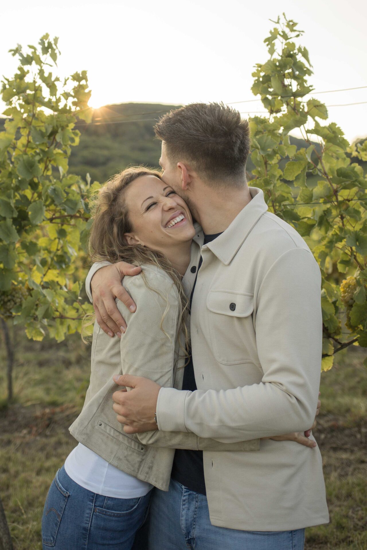 Verlobungsfotos zum Sonnenuntergang in den Weinbergen