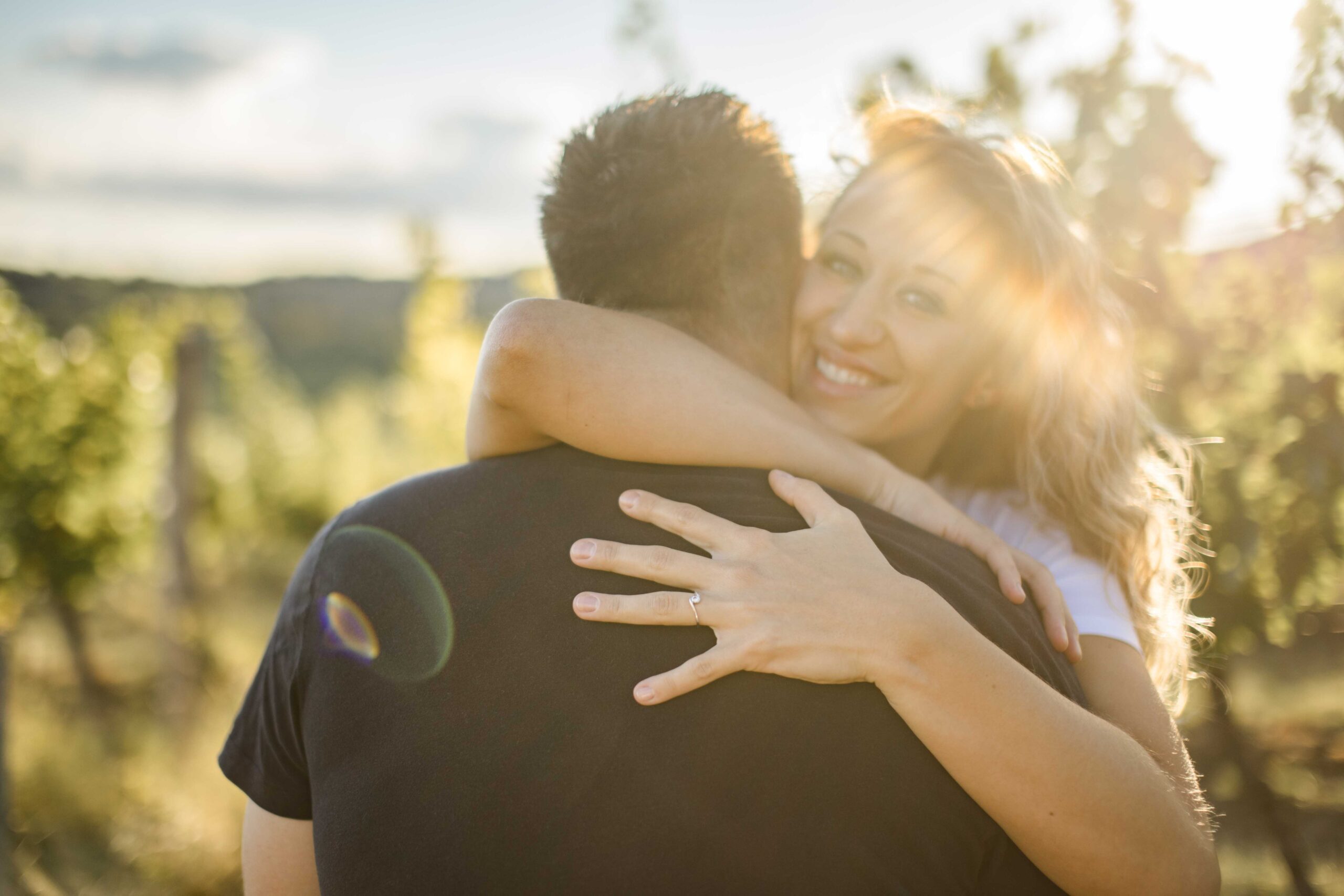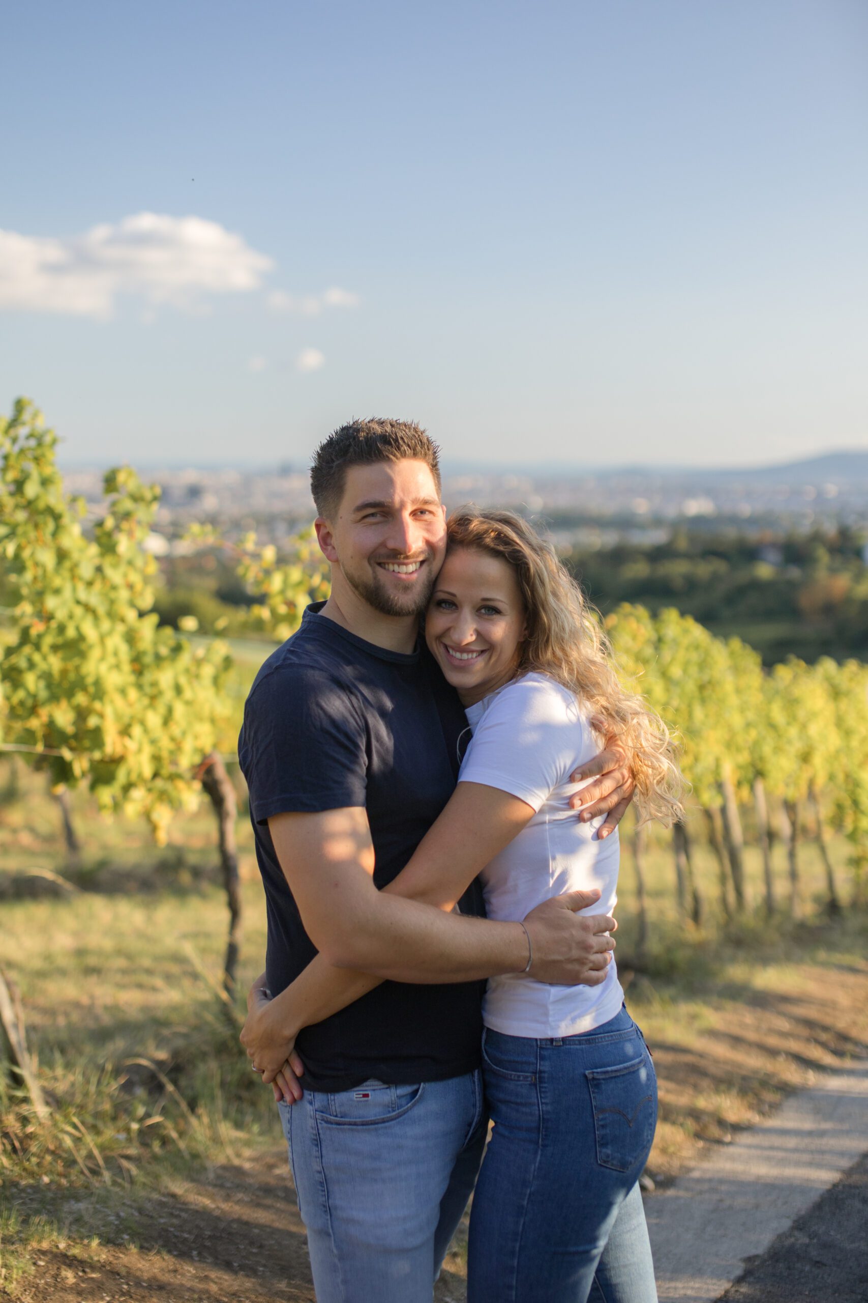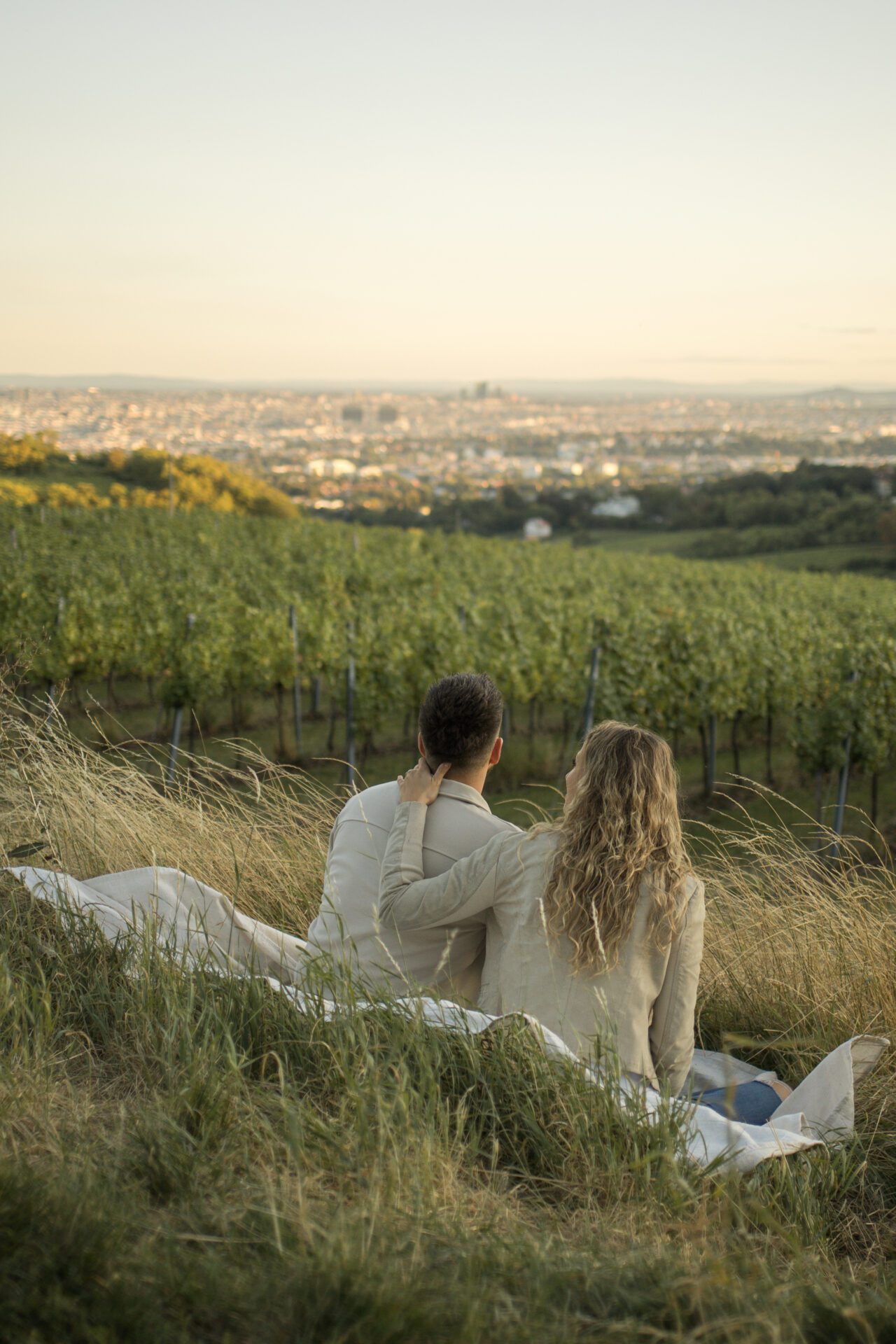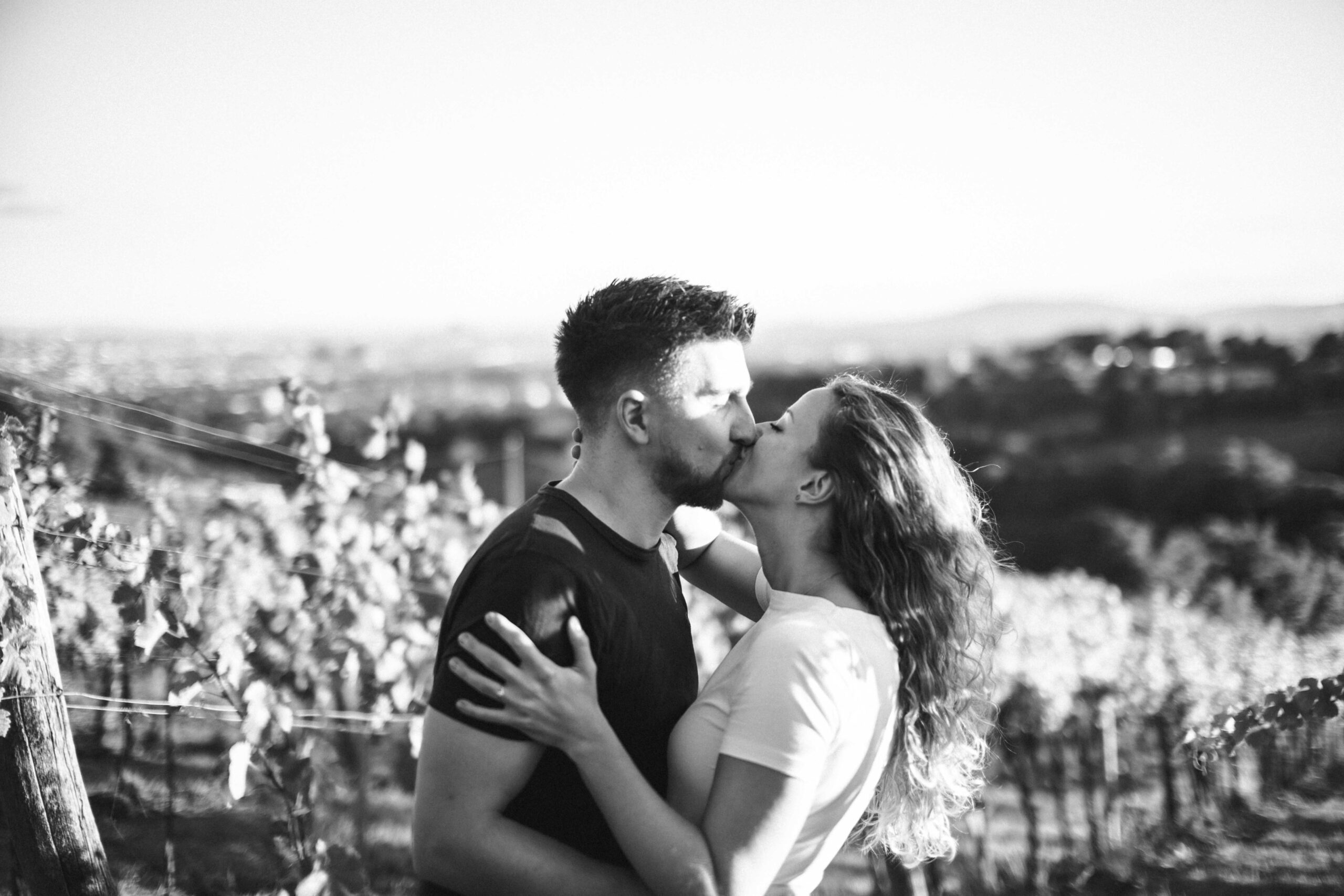Verlobungsfotos zum Sonnenuntergang in den Weinbergen
